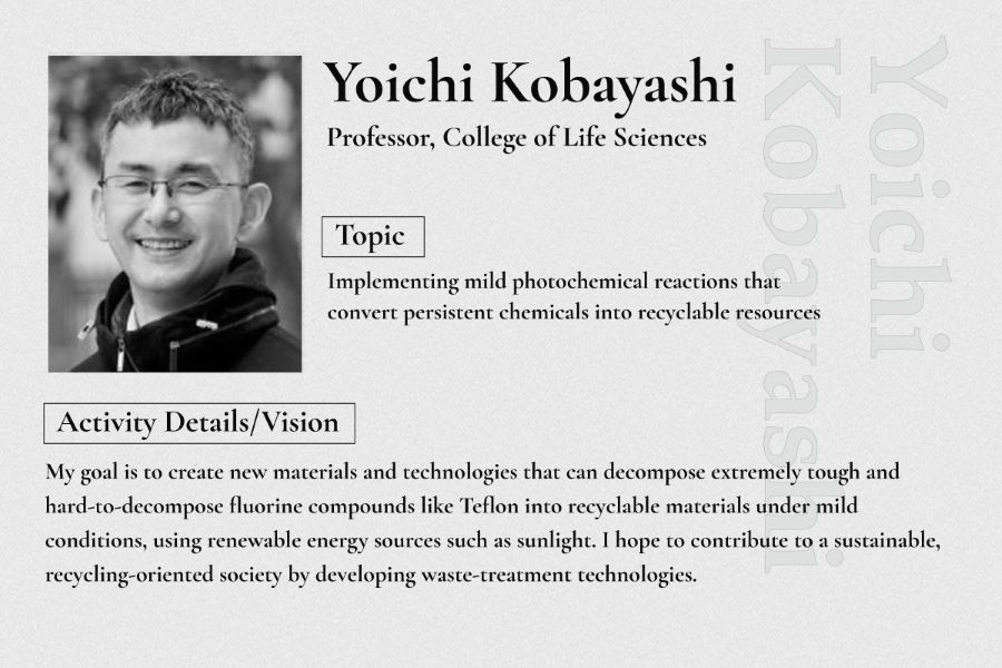 Professor Kobayashi specializes in the study of functional materials utilizing light. In particular, his research aims to use light to decompose per- and polyfluoroalkyl substances (PFAS), which are called “forever chemicals,” and has attracted attention as having the potential to contribute to environmental protection by facilitating the advancement of recycling technology.