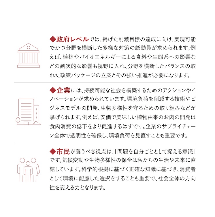 地球環境にまつわる多様な問題を解決するためには、政府や企業、市民一人ひとりの具体的な行動が重要です。