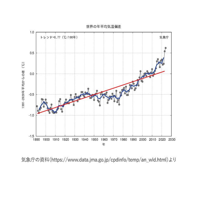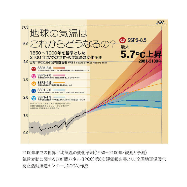 その結果として、地球の平均気温は産業革命前と比較してすでに 1.1 ℃上昇しています(IPCC第6 次報告書, 2021) 。