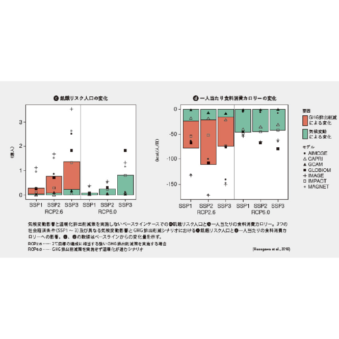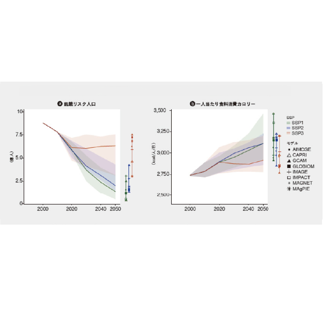 こちらのグラフでは、将来の社会経済の状況が将来の飢餓リスクにどのように影響するのかを、人口増加や経済発展レベルの違いを考慮してシミュレーションしています。将来の人口増加が抑制され、経済が強く発展する場合(SSP1 ,緑の線グラフを参照)、飢餓リスクに直面する人口はより減少することが示されています。