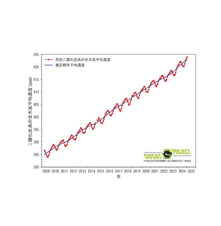 近年の気温上昇は、人間活動による温室効果ガス (二酸化炭素(CO₂) やメタンなど)の増加が主因とされています。産業革命以降、人為起源の温室効果ガスの排出量は継続的に増加し、「全大気」のCO₂の月別平均濃度は2015 年、400ppm(ppm は濃度の単位で100万分の1 を示す)に達しました(国立環境研究所「GOSAT プロジェクト」の「月別二酸化炭素の全大気平均濃度速報値」)。