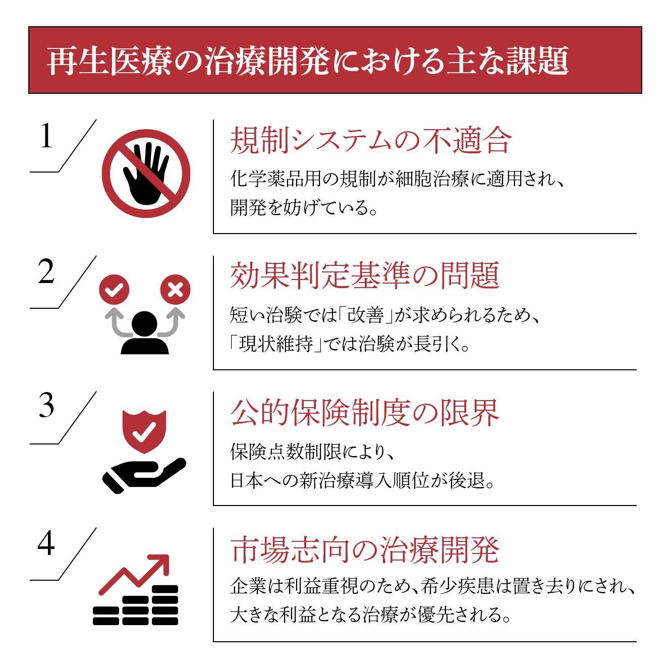 再生医療の治療開発で最も大きな課題は、既存の規制システムが細胞治療に適していないことです。現在の医薬品規制は、主に欧米の規制当局と製薬企業が化学物質である医薬品のために作り上げたルールが基盤となっています。