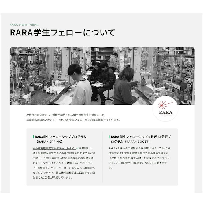 RARAでは博士後期課程学生が自らの専門研究分野を深めるだけでなく、異なる分野の研究者などとの協働を通じてソーシャルインパクトを発揮することのできる「T型博士インパクトメーカー」を育成する「RARA 学生フェローシッププログラム」(RARA×SPRING)を推進しています。