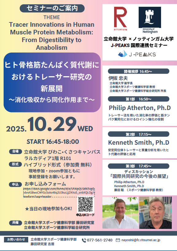 本セミナーにて、Philip Athertonフェローは、新たに開発された消化率トレーサー法に基づく食事性たんぱく質の消化吸収の定量化、さらにロイシン強化が筋たんぱく質合成に及ぼす効果に関する最新の臨床研究成果について解説します。最後に、Athertonフェロー、ノッティンガム大学のKenneth Smith教授、そして藤田聡アソシエイトフェローが、「国際共同研究の今後の展望」と題してディスカッションを行います。