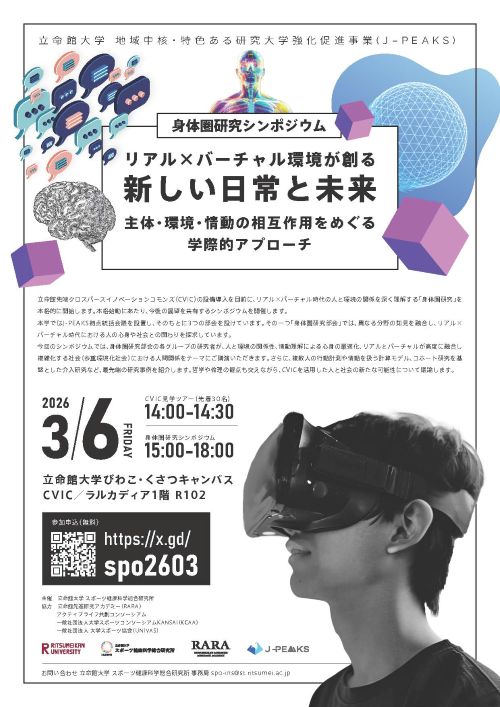 立命館大学 地域中核・特色ある研究大学強化促進事業(J-PEAKS) 身体圏研究シンポジウム「リアル×バーチャル環境が創る新しい日常と未来 主体・環境・情動の相互作用をめぐる学際的アプローチ」